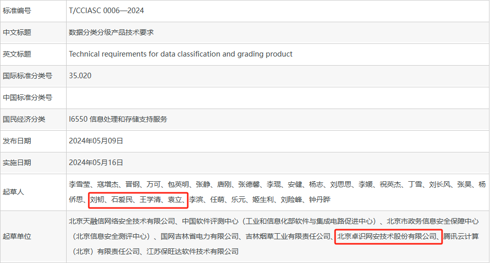 中国计算机行业协会发布的T/CCIASC 0006—2024《数据分类分级产品技术要求》于2024年5月16日正式实施,卓识网安刘韧、石爱民、王学清、袁立四位专家参与了该标准的编制。