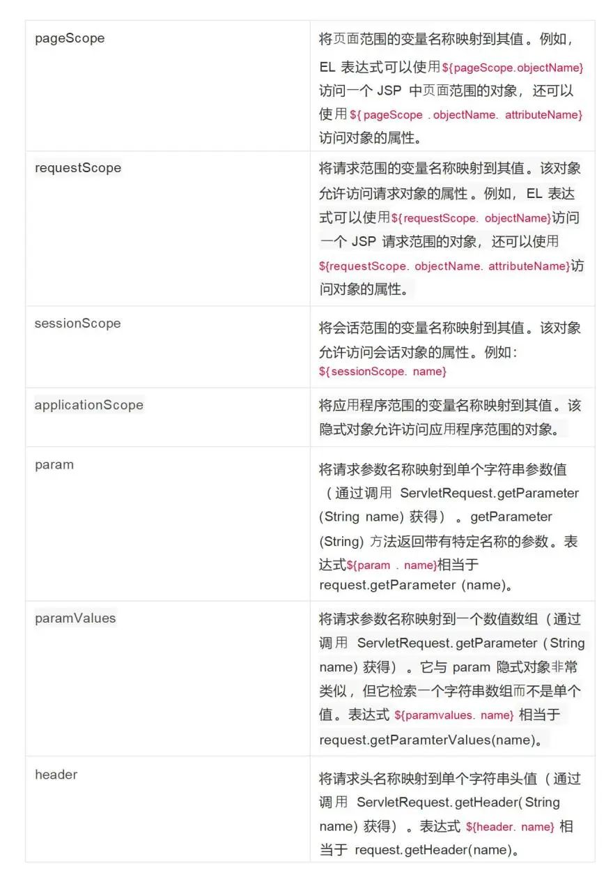 ●EL表达式内置的隐式对象如下,常⽤的param、header、cookie等,这些隐式对象可⽤于获取 webshell的相关参数。