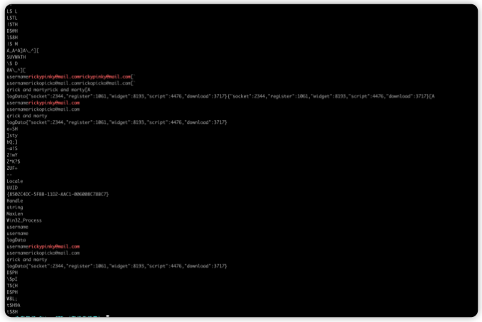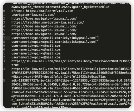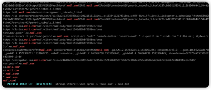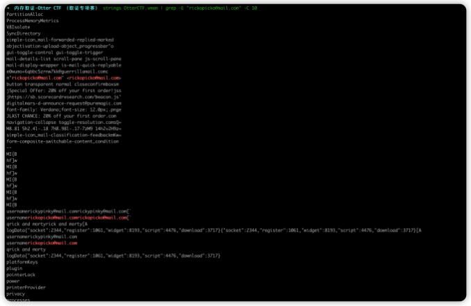分析发现[email protected]⽤户内存⽂件中包含—部分类似邮件源数据字符, 猜测 [email protected]为hack邮箱, 继续进⾏查找