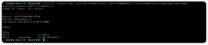 根据题⽬提示, 需要查找PC名称以及IP地址 ⾸先使⽤hive list列出注册表