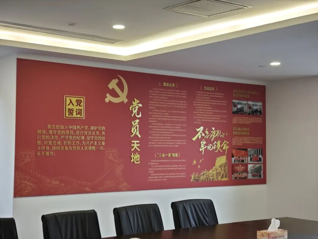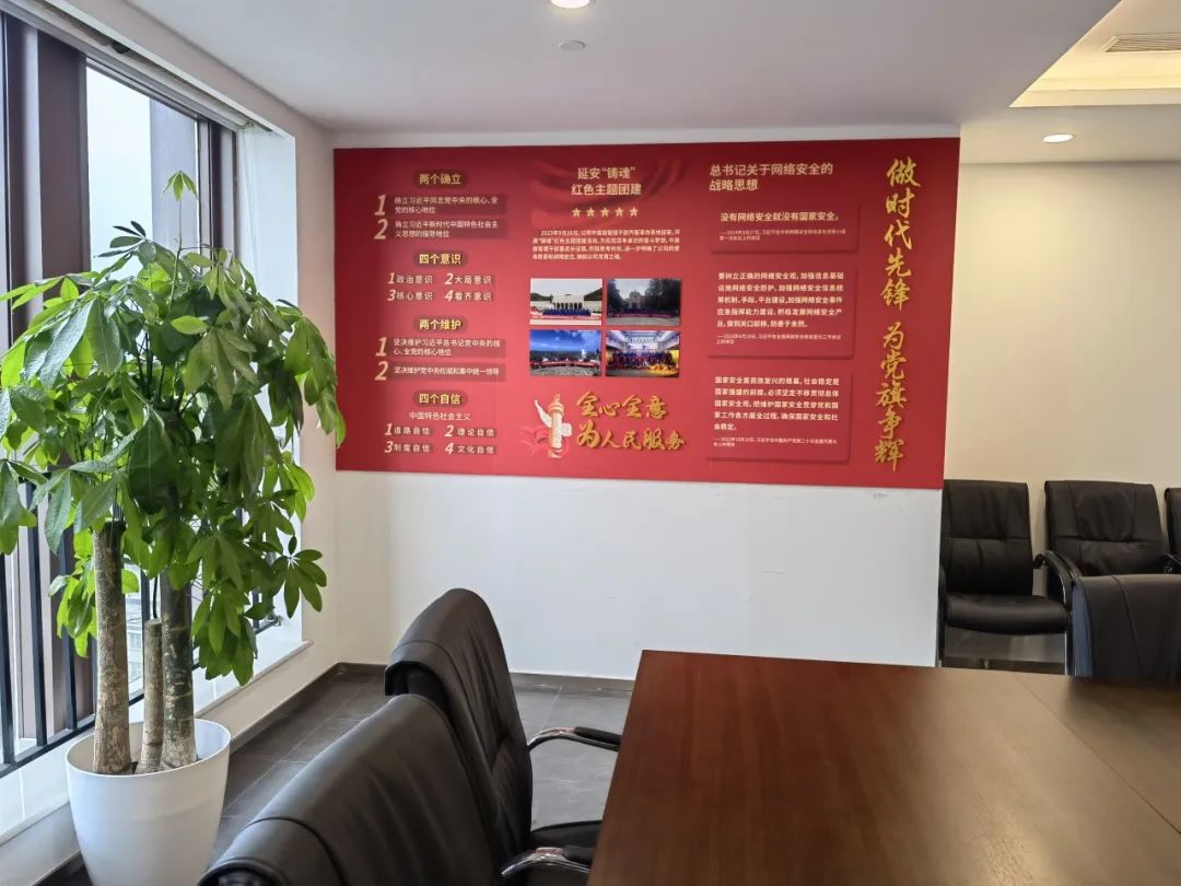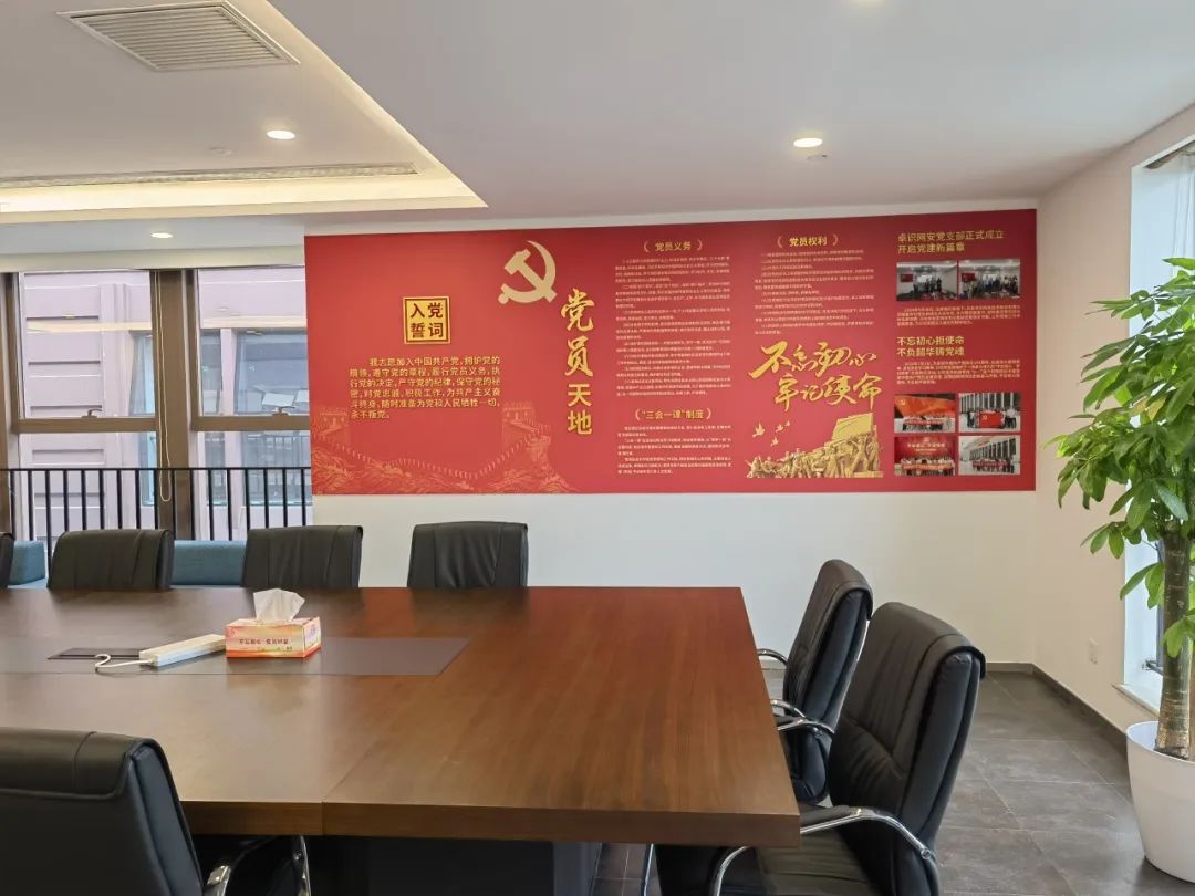 为深入学习贯彻习近平新时代中国特色社会主义思想和党的二十大、二十届二中、三中全会精神,贯彻落实新时代党的建设总要求和新时代党的组织路线,持续深入推进党支部规范化、标准化建设,卓识网安党支部按照“有场所、有设施、有标志、有党旗、有制度、有书报” 六有标准 ,秉持节约实用、简洁庄重的设计理念,把党建活动室与会议室统筹规划、合理布局,切实为党员教育、管理、活动打造红色阵地。党建活动室设施齐全、功能完备,不仅为党员提供了良好的学习交流环境,促进党员之间的思想碰撞和共同进步,更提升了党员的归属感、荣誉感。