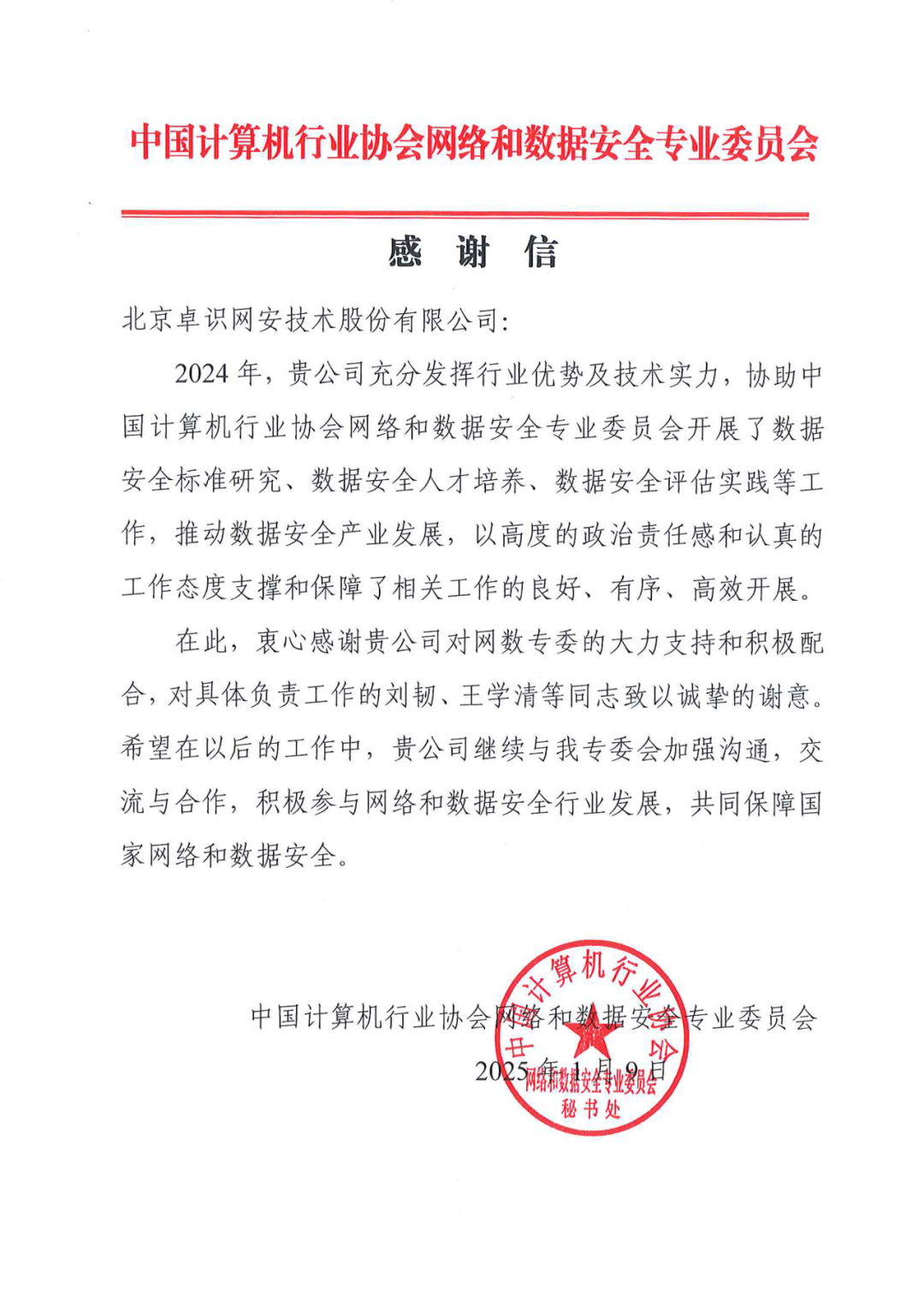 喜讯丨卓识网安收到中国计算机行业协会网络和数据安全专业委员会感谢信