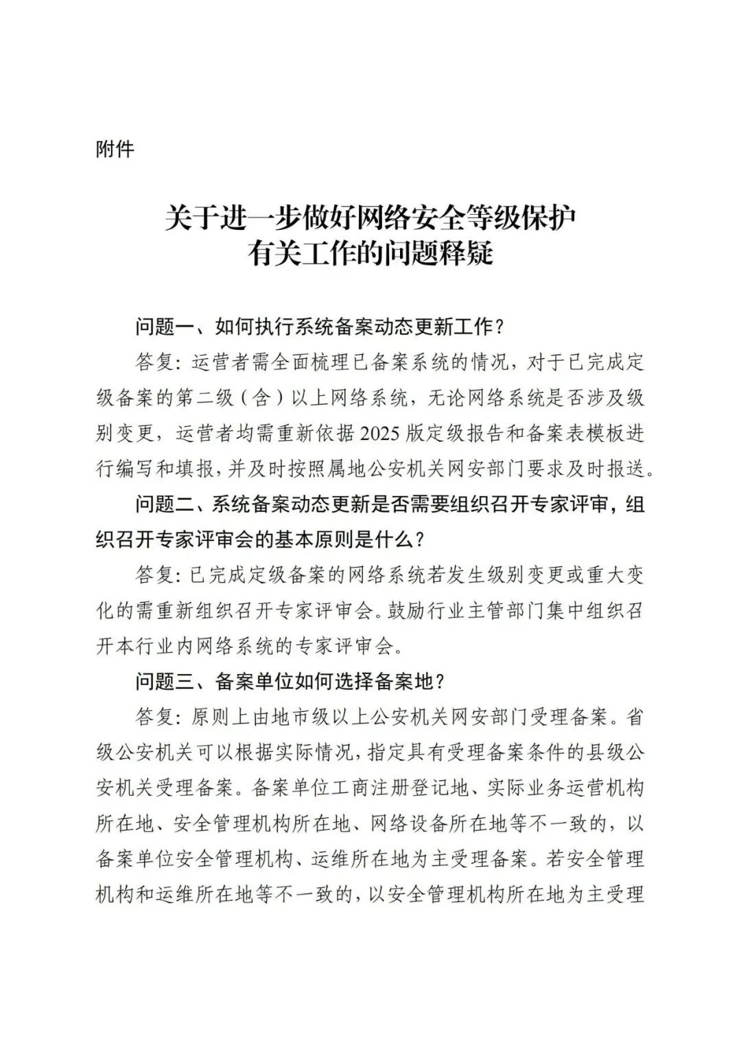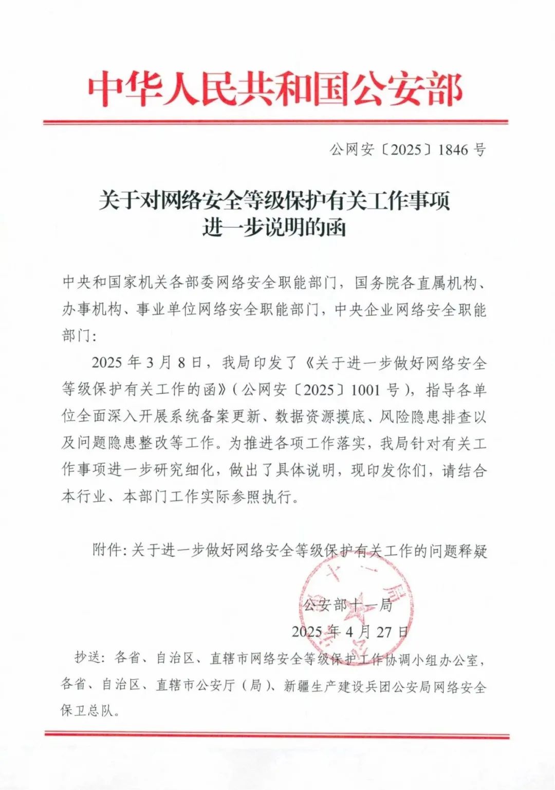 公网安[2025]1846号文关于对网络安全等级保护有关工作事项进一步说明的函原文