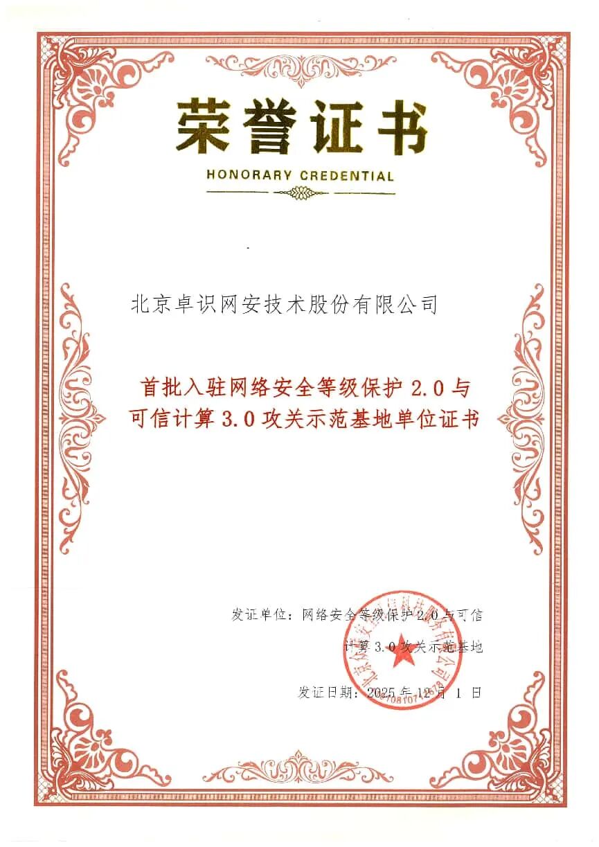 卓识网安作为重要成员单位,正式入驻国家网络安全等级保护制度2.0与可信计算3.0攻关示范基地,深度融入由国家主导的网络安全协同创新体系,将与政产学研各界力量共同筑牢数字安全的新基石。