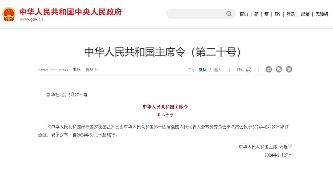 中华人民共和国保守国家秘密法 (1988年9月5日第七届全国人民代表大会常务委员会第三次会议通过 2010年4月29日第十一届全国人民代表大会常务委员会第十四次会议第一次修订 2024年2月27日第十四届全国人民代表大会常务委员会第八次会议第二次修订) 目录 第一章 总则 第二章 国家秘密的范围和密级 第三章 保密制度 第四章 监督管理 第五章 法律责任 第六章 附则 第一章 总则 第一条 为了保守国家秘密,维护国家安全和利益,保障改革开放和社会主义现代化建设事业的顺利进行,根据宪法,制定本法。 第二条 国家秘密是关系国家安全和利益,依照法定程序确定,在一定时间内只限一定范围的人员知悉的事项。 第三条 坚持中国共产党对保守国家秘密(以下简称保密)工作的领导。中央保密工作领导机构领导全国保密工作,研究制定、指导实施国家保密工作战略和重大方针政策,统筹协调国家保密重大事项和重要工作,推进国家保密法治建设。 第四条 保密工作坚持总体国家安全观,遵循党管保密、依法管理,积极防范、...