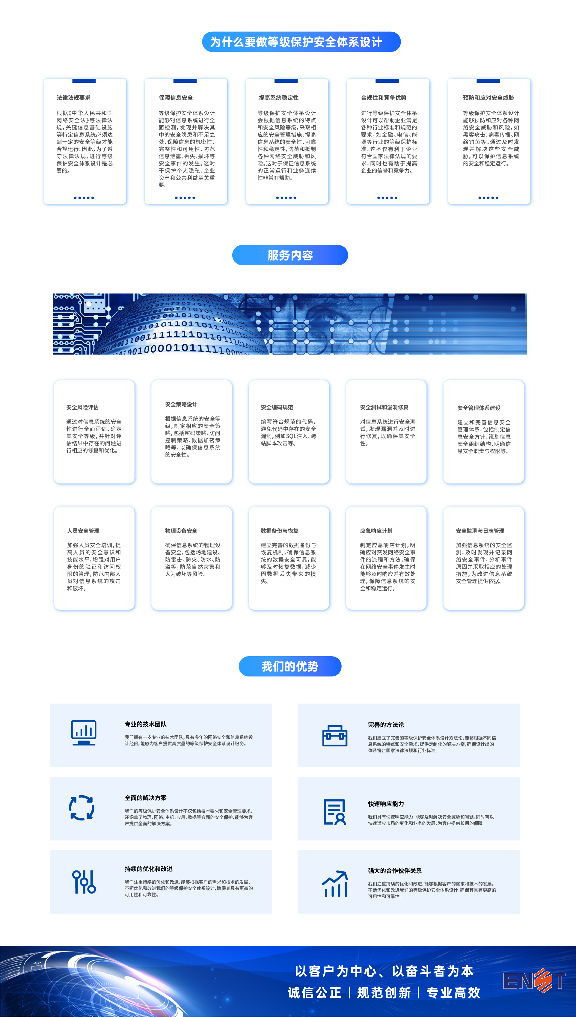 等级保护安全体系设计是指按照《信息安全等级保护管理规定》的标准,根据信息系统的特点和安全风险等级,对其进行分类评估,并实施相应的安全管理措施,保障信息的机密性、完整性和可用性,防范信息泄露、丢失、损坏、灾害等安全事件的发生。同时需要从安全管理体系建设方面入手,建立和完善信息安全管理体系,不断提高信息安全的整体水平。等级保护安全体系设计的目的在于保护国家安全、社会公共利益和个人合法权益,维护国家与行业的稳定运行,提高信息系统的安全性、可靠性和稳定性,防范和抵制各种网络安全威胁和风险。